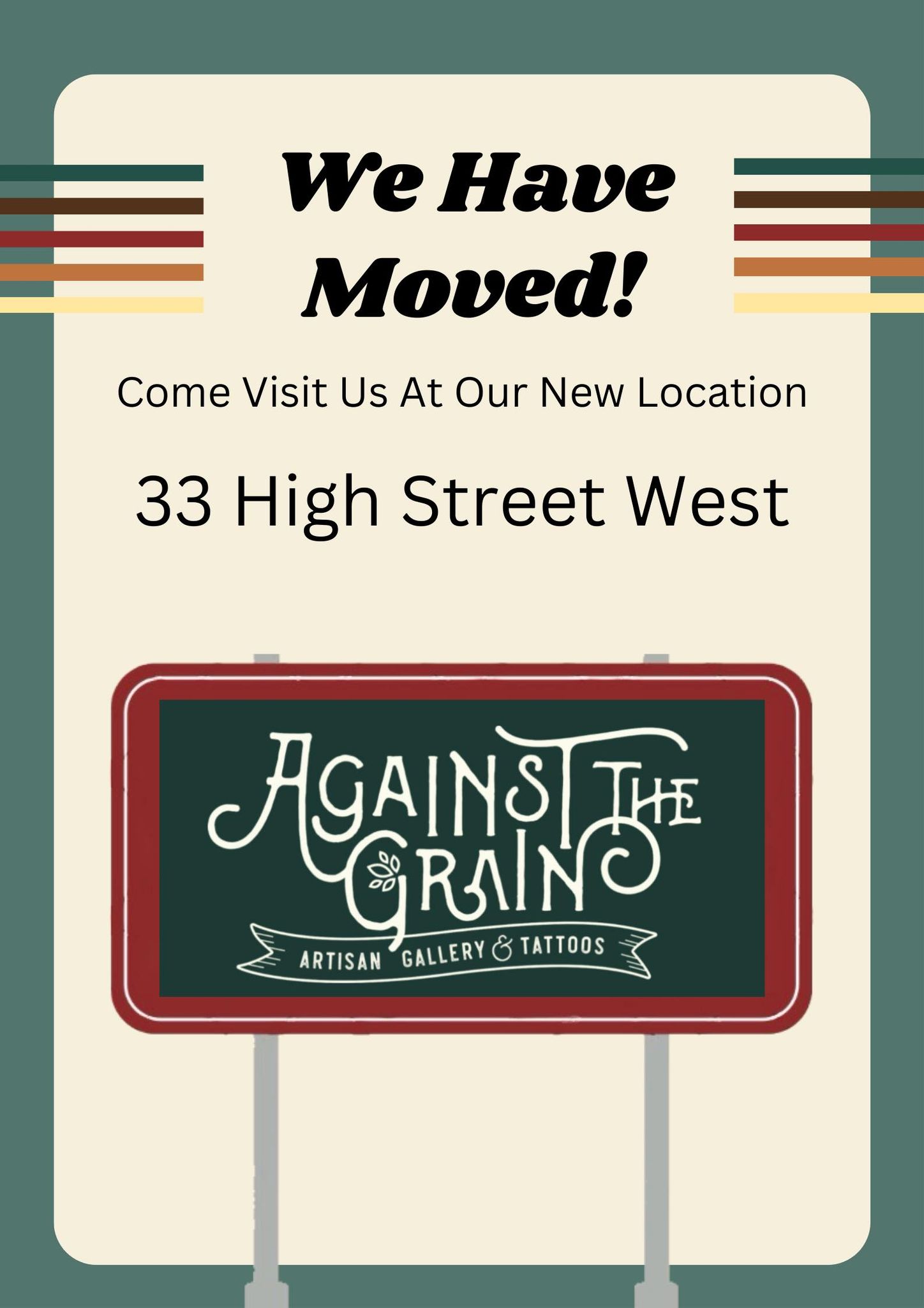 Against the Grain Artisan Gallery & Tattoo is excited to announce that due to the continuous growth of our store, we have outgrown our old space and have relocated to our new, larger location at 33 High Street in Moose Jaw, Saskatchewan. This expansion allows us to better serve our valued customers by offering an even wider selection of unique, handcrafted artwork and top-notch tattoo services. As well as having the dance studio inhouse.